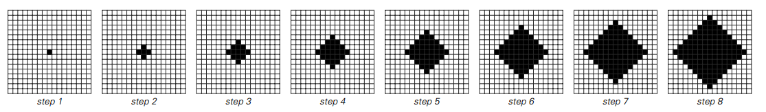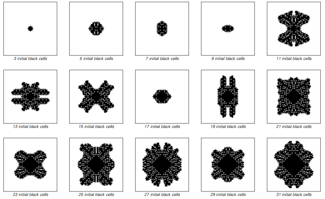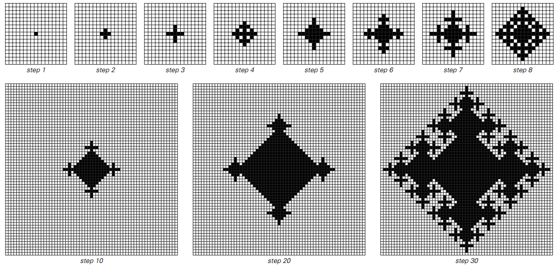 从一个单一的黑色单元开始,这条规则只产生一个均匀扩展的菱形黑色单元区域。 但通过稍微改变规则,可以获得更复杂的增长模式。 下面的图片显示了发生了什么,例如,如果在上一步中只有一个或全部四个邻居是黑色的, 则每个单元格变黑,但其他方式保持与之前相同的颜色。
