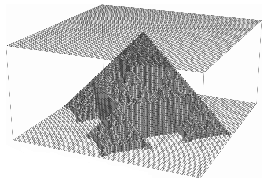 三维物体通过堆叠连续的二维图案形成,在前一页的元胞自动机的进化过程中产生。 右边的大图显示了200步的演变。