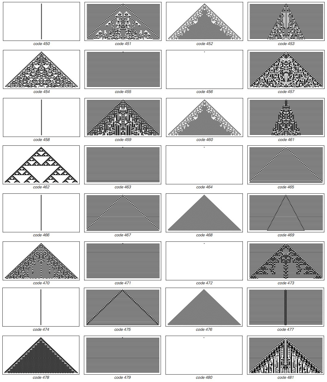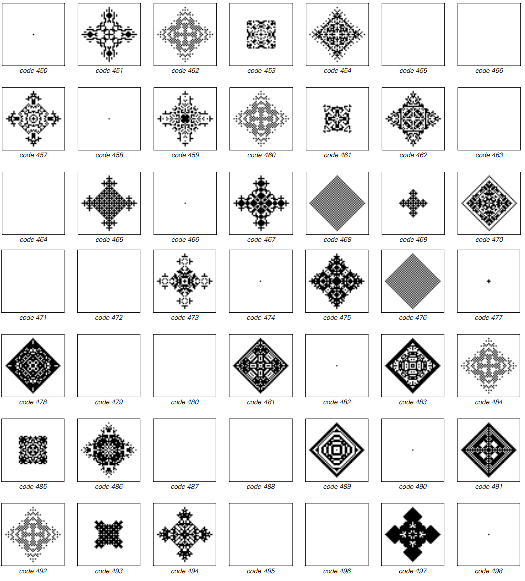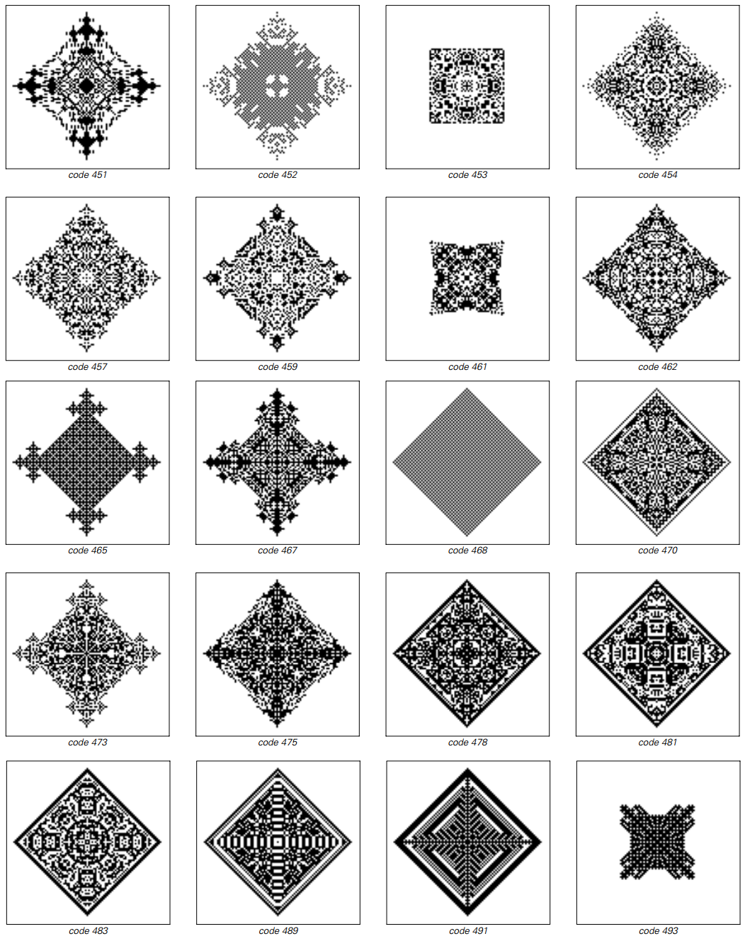 由一系列二维元胞自动机规则生成的模式。 模式是从一个黑色方块开始,然后运行22个步骤。 在每种情况下,代码编号的基数为2的数字序列指定如下规则。 最后一位数字指定如果在前一步骤中所有邻居都是白色的,则中心单元应该是什么颜色,并且它也是白色。 倒数第二位指定如果所有邻居都是白色会发生什么,但中心单元本身是黑色的。 然后每个较早的数字指定如果越来越多的邻居是黑色会发生什么。 (比较第60页。)