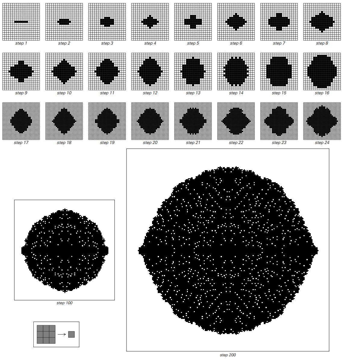 但是,并非所有的二维元胞自动机只能产生简单的整体形状。 例如,第179-181页的图片显示了一条规则,但没有。 这个规则实际上很简单:它只是指出,只要其八个邻居中的三个(包括对角线)是黑色的, 一个特定的单元格就会变黑,否则它应该保持与以前相同的颜色。
