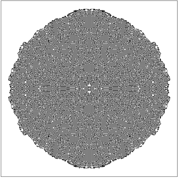元胞自动机产生一个形状非常接近圆形的图案。 所使用的规则与前一页中的规则类型相同,但现在只有具有3个黑色邻居的中心单元才变为黑色。 如果它有1,2或4个黑色邻居,则保持与之前相同的颜色,并且如果它有5个或更多的黑色邻居,则在下一步(代码号746)变为白色。 初始条件由一排7个黑色单元组成,就像上一页中的图片一样。 此处显示的模式是系统演进过程中400步骤的结果。 经过t步后,近似圆的半径约为 0.37t。