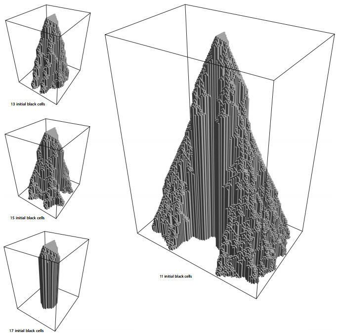 第181页上的图片显示了从一排十一个黑色单元开始,然后演变几百个步骤而产生的行为。 获得的形状似乎不断变化,没有简单的整体形式被生产出来。