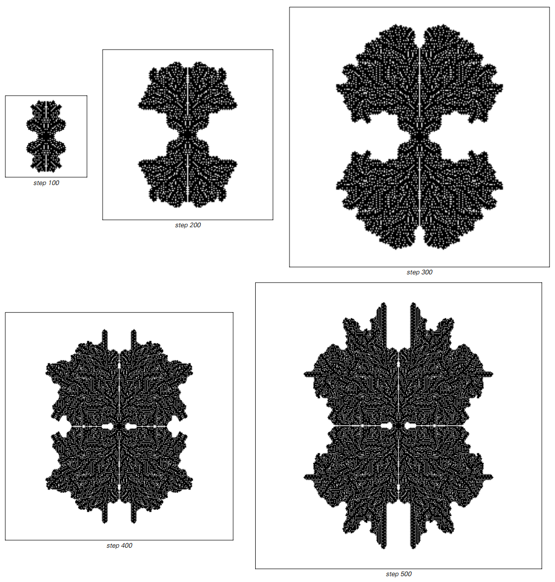 为了通过这个规则获得任何增长,必须从至少三个黑色单元开始。 页面顶部的图片显示了各种数量的黑色单元会发生什么情况。 在某些情况下,产生的图案相当简单——通常只需几步即可停止生长。 但在其他情况下,产生了更复杂的模式,这些模式通常显然会持续增长。