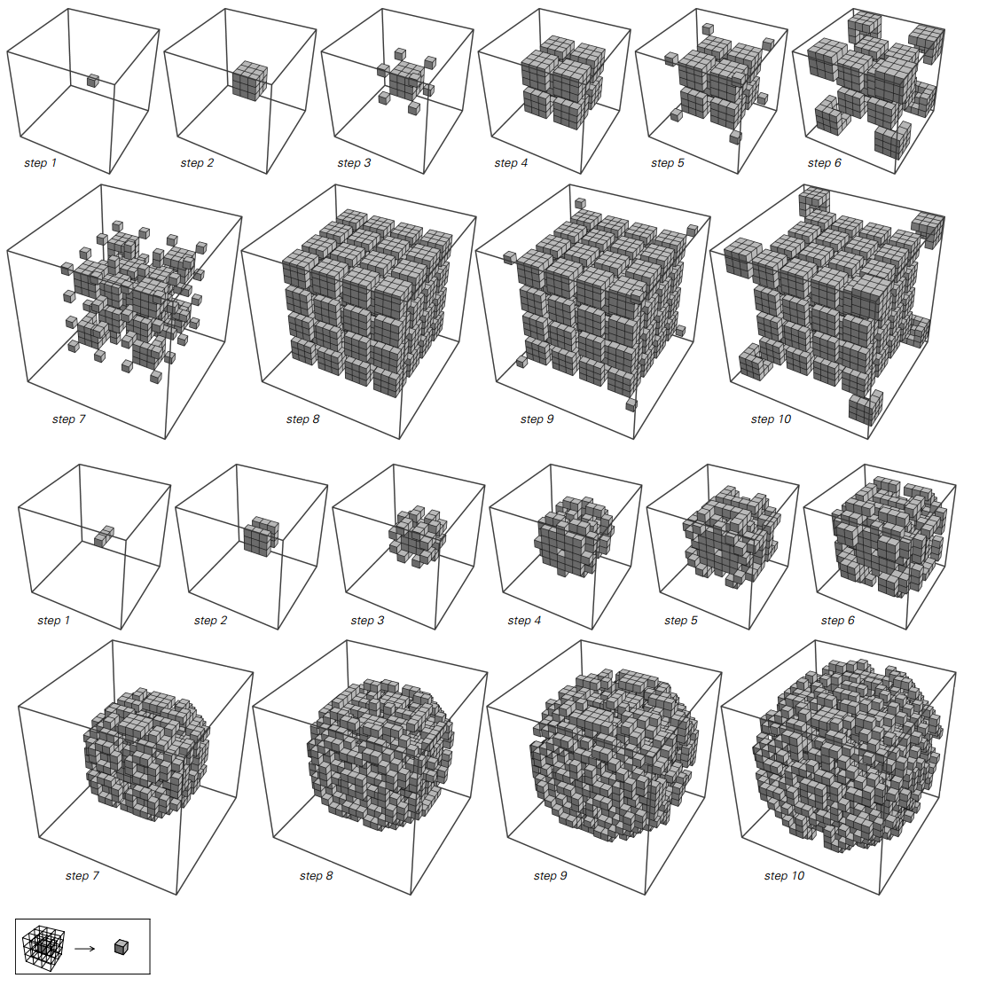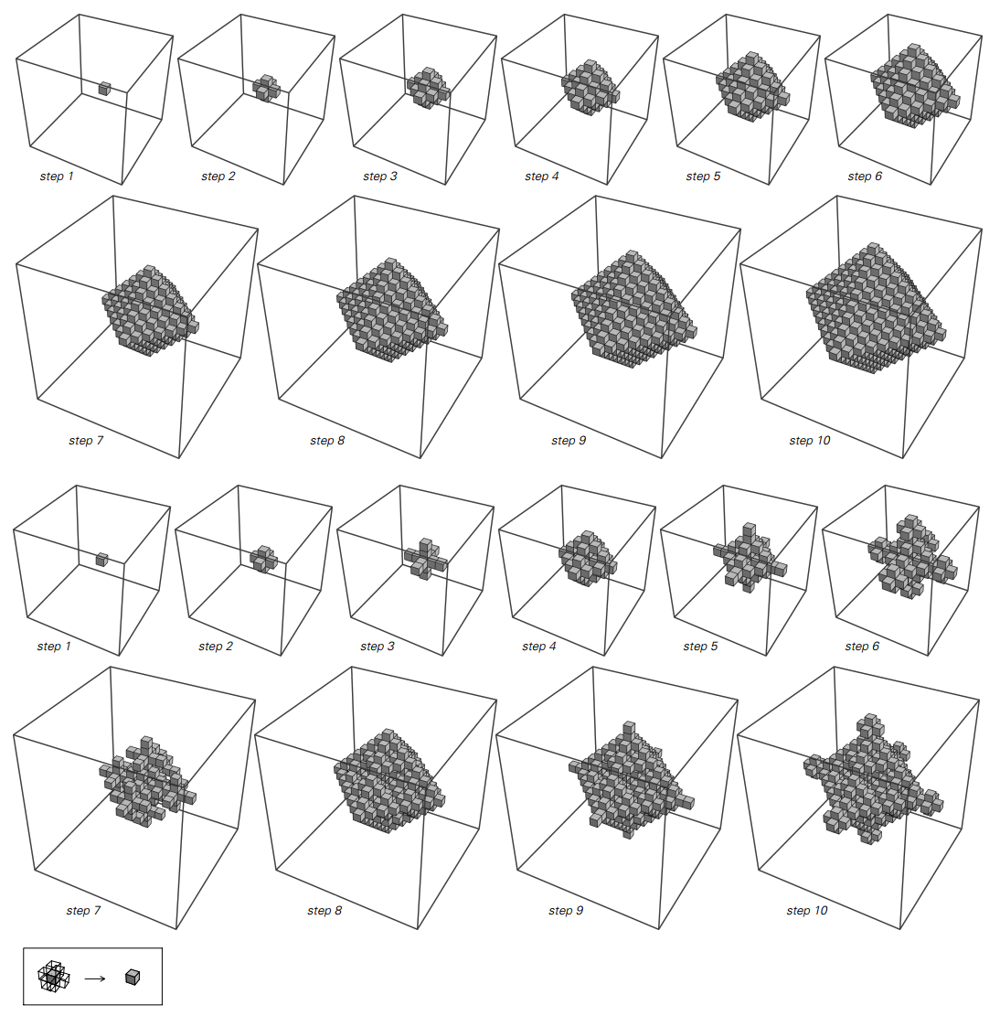 三维细胞自动机的例子。 在最上面的一组图片中,该规则规定,只要在共享面部的六个邻居中的任何一个在之前的步骤中黑色,该单元就会变黑。 在底部的图片中,规则指定了一个单元格只有在其前六个步骤中只有六个邻居中的一个是黑色时才会变黑。 在这两种情况下,初始条件都包含一个黑色单元。 在顶部图片中,获得的极限形状是正八面体。 在底部的图片中,它是一个类似于第171页上的二维图案的嵌套图案。